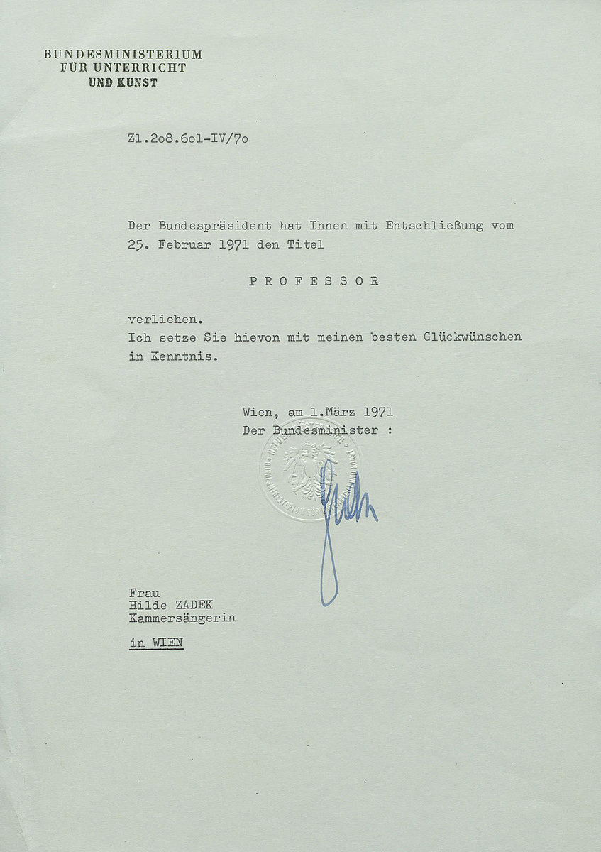 Einige ihrer Studenten/innen sind ebenso wie Hilde Lehrende und tragen ihr Credo weiter und so bleibt als wichtigste Aussage von Hilde Zadek, der Pädagogin: „Wenn ich oben Rechenschaft über mich ablegen müsste und gefragt würde, ‚was haben Sie erreicht?‘, dann würde ich sagen: ‚Ich habe gute Gesangslehrer ausgebildet‘.“
