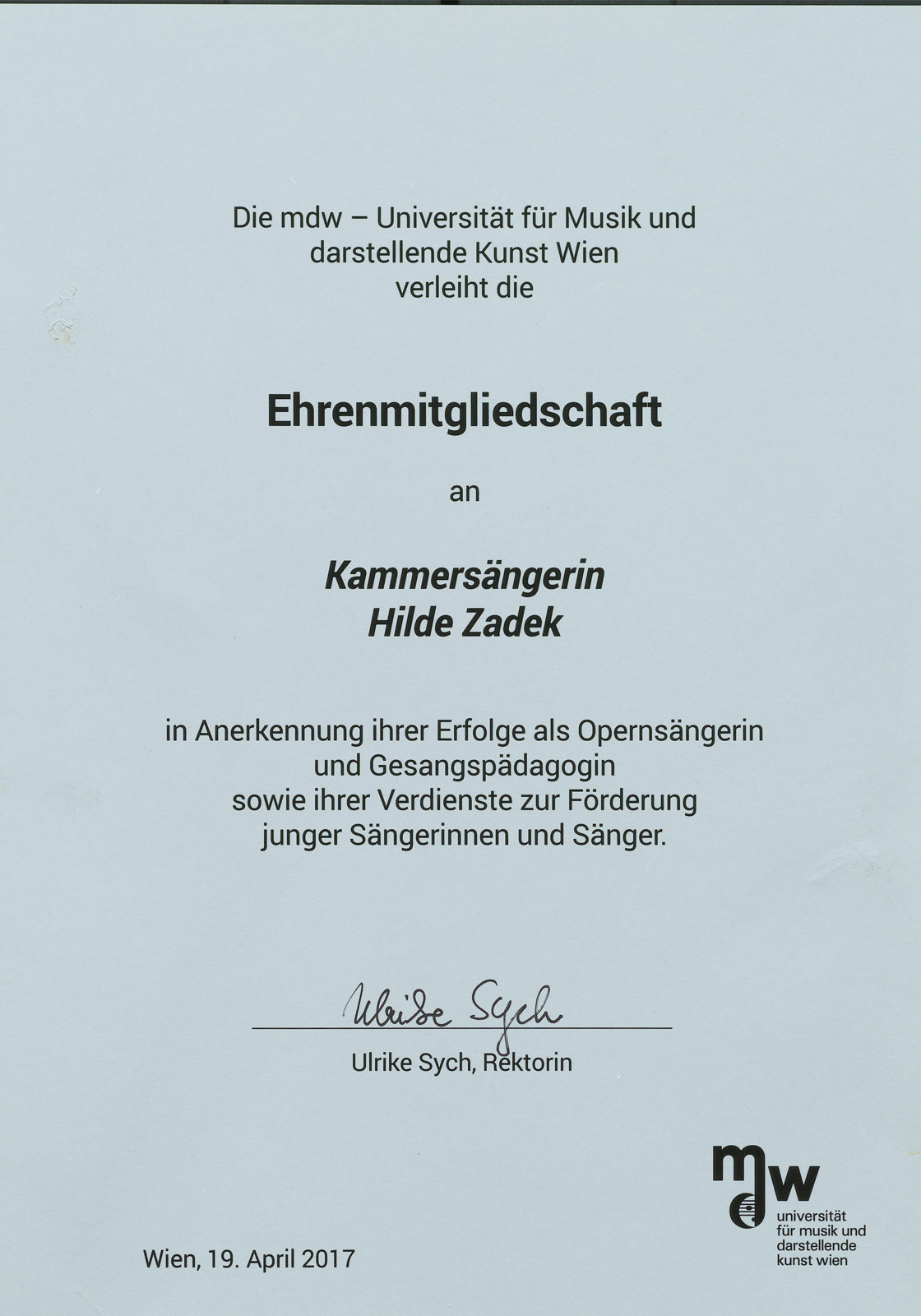 „Ich bin so glücklich, dass mein Weg mich 1990 zu Hilde Zadek nach Wien führte. Damals war ich an der Wiener Volksoper engagiert und sang führende Sopranrollen in Oper und Operette. Noch Mitte 20 hatte ich in Kanada Gesang studiert, aber ich brauchte mehr Anleitung und technische Aufsicht. Es war ein großer Bonus, dass Hilde fast alle meine Rollen gespielt hatte - sie kannte jede Note und Nuance, kannte die Orchestrierung von innen und außen und hatte natürlich unter den besten Dirigenten ihrer Zeit gesungen. Sie hat mir dieses Wissen so großzügig und frei vermittelt. Unser Unterricht war freudig, auch wenn ich ein technisches Konzept als herausfordernd oder entmutigend empfand. Hildes Energie, Humor und ihre unermüdliche positive Lebenseinstellung haben mich sehr beeindruckt. Ihre tiefe Liebe zur Musik in jeder Form hat mich inspiriert. Ich vertraute eindeutig ihrer Meinung und sie beriet mich tadellos in Bezug auf die Auswahl des Repertoires, als sich meine Stimme entwickelte und wuchs. Wir wurden im Laufe der Jahre liebe Freunde und obwohl ich 1995 von Wien weggezogen bin, bin ich oft zu Unterrichten und Besuchen bei Hilde zurückgekehrt, wenn ich nach Wien zurückgekehrt bin. Ich unterrichte jetzt selbst und strebe danach, die Art von Lehrerin zu sein, die Hilde für mich war - freundlich, positiv und großzügig.“